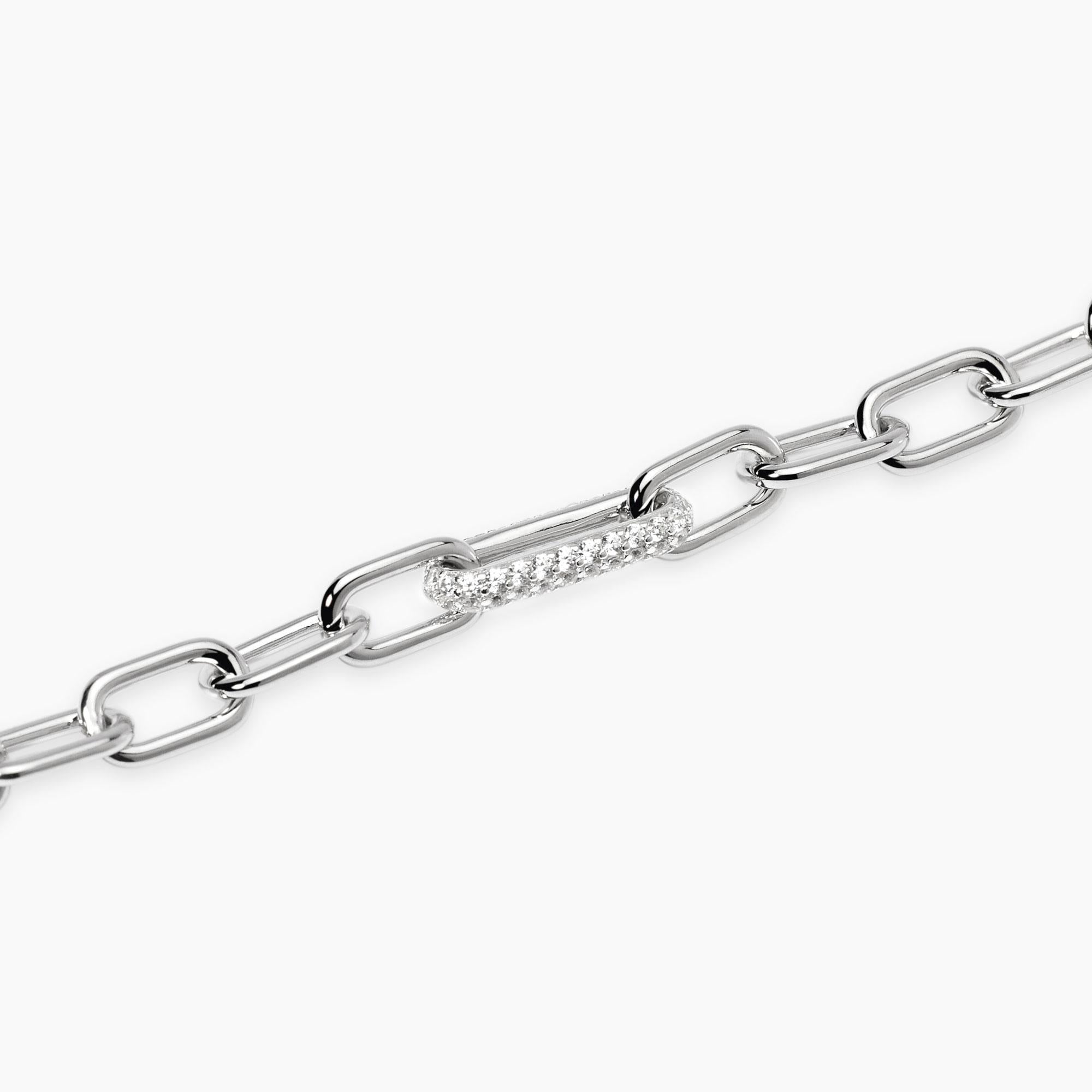 Bracciale in argento rodiato con maglie allungate e elementi in zirconi bianchi.