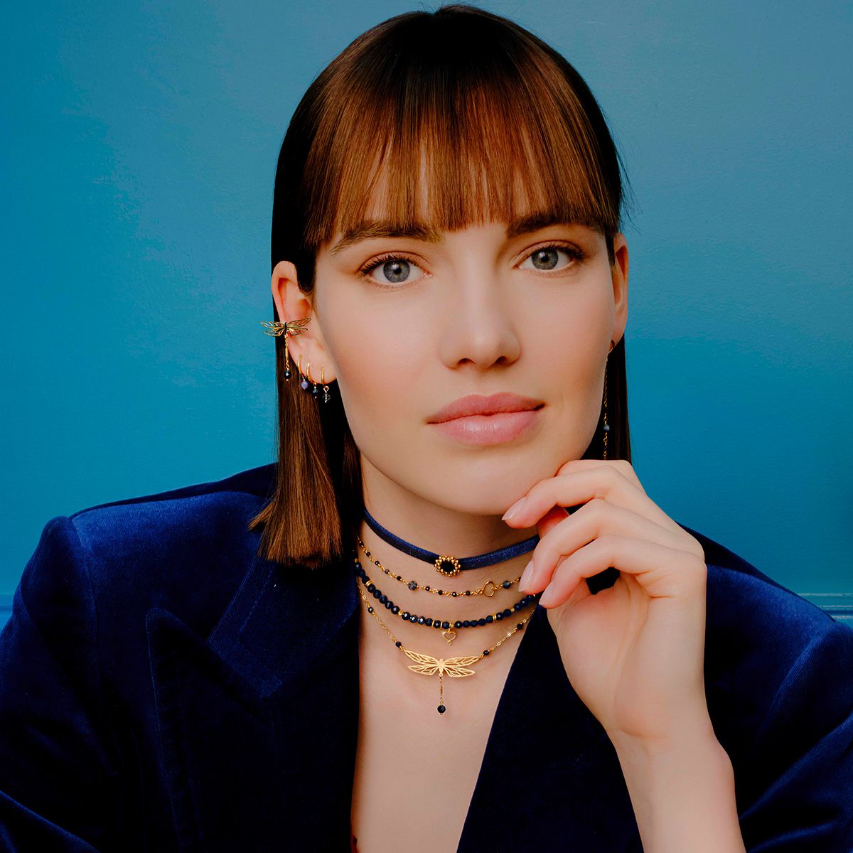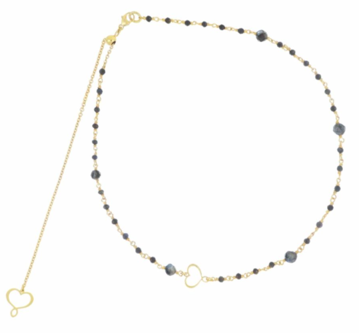 Rosario con pietre di zaffiro blu sfaccettato di 2 mm, sfere di acquamarina scura sfaccettata di 4 mm e cuore maman. La catena a maglie è realizzata in argento 925 placcato in oro giallo ad alto spessore ed alta resistenza. La circonferenza è regolabile da un minimo di 30,5 cm a un massimo di 41 cm grazie alla piccola sfera scorrevole. Cuore Maman traforato all'estremità. Chiusura a moschettone.