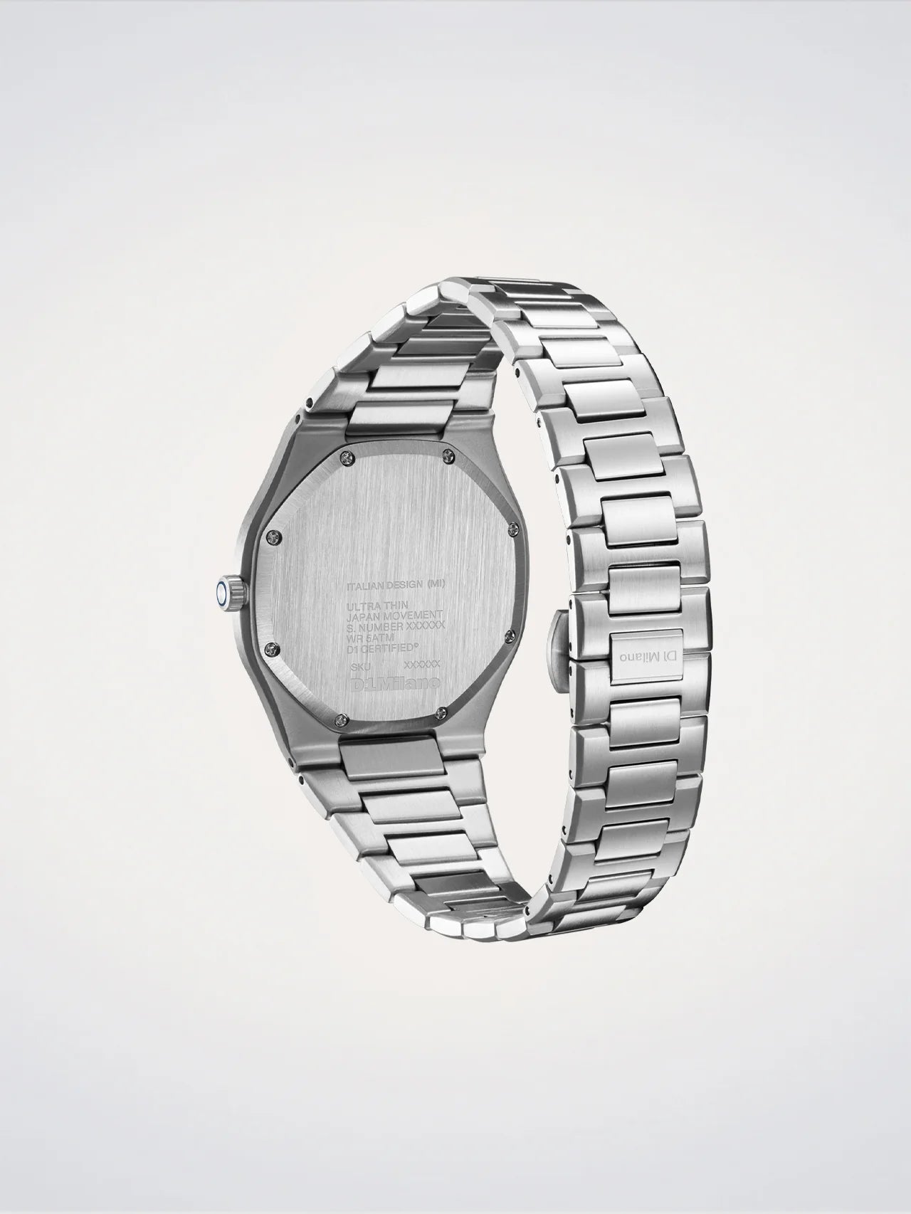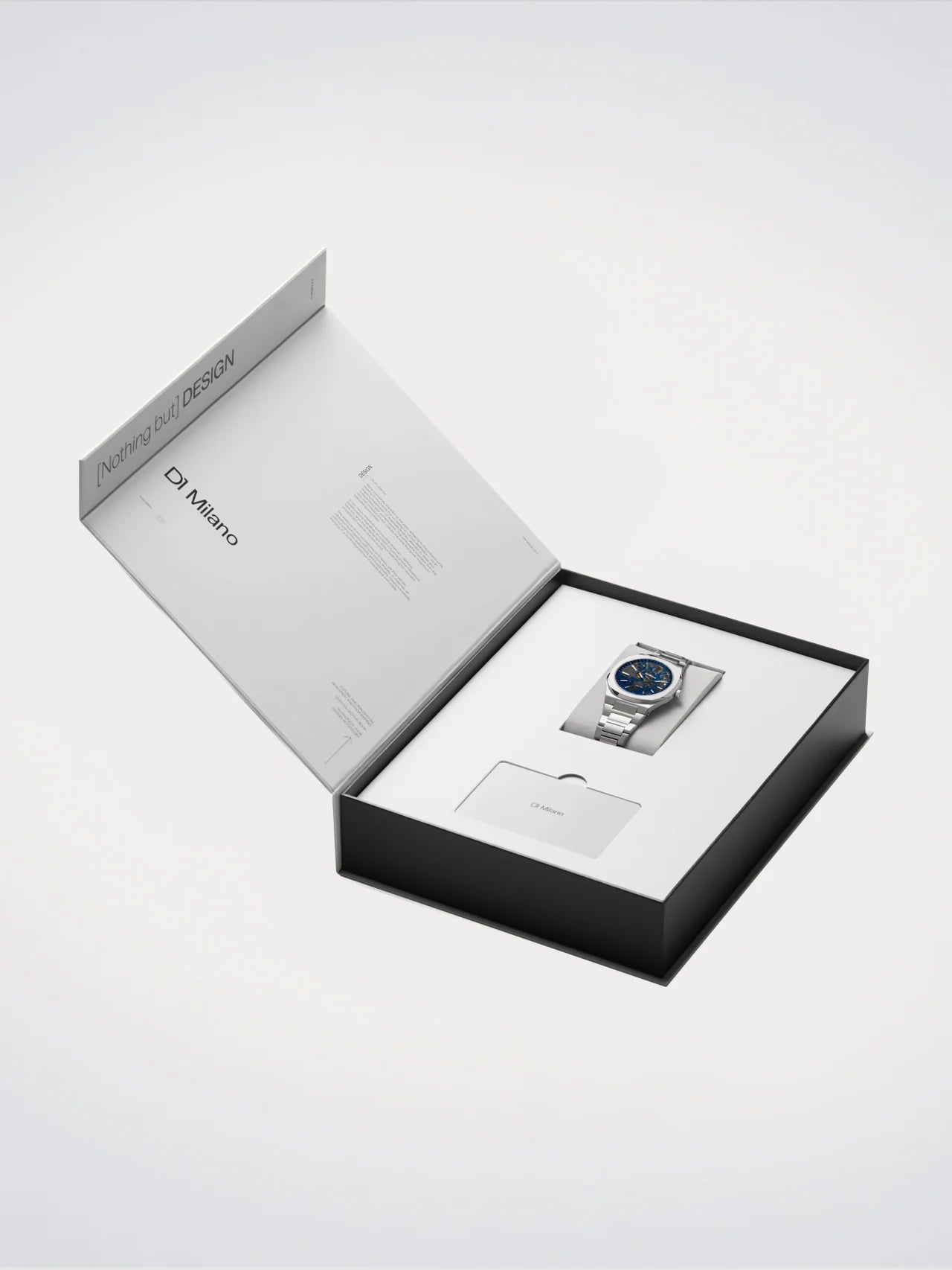 Questo orologio è dotato di un Cassa in acciaio inossidabile da 39 mm e quadrante in ottone blu. Protetto da vetro zaffiro antiriflesso, il bracciale in acciaio integrato segue la geometria naturale del polso per un design confortevole e discreto.