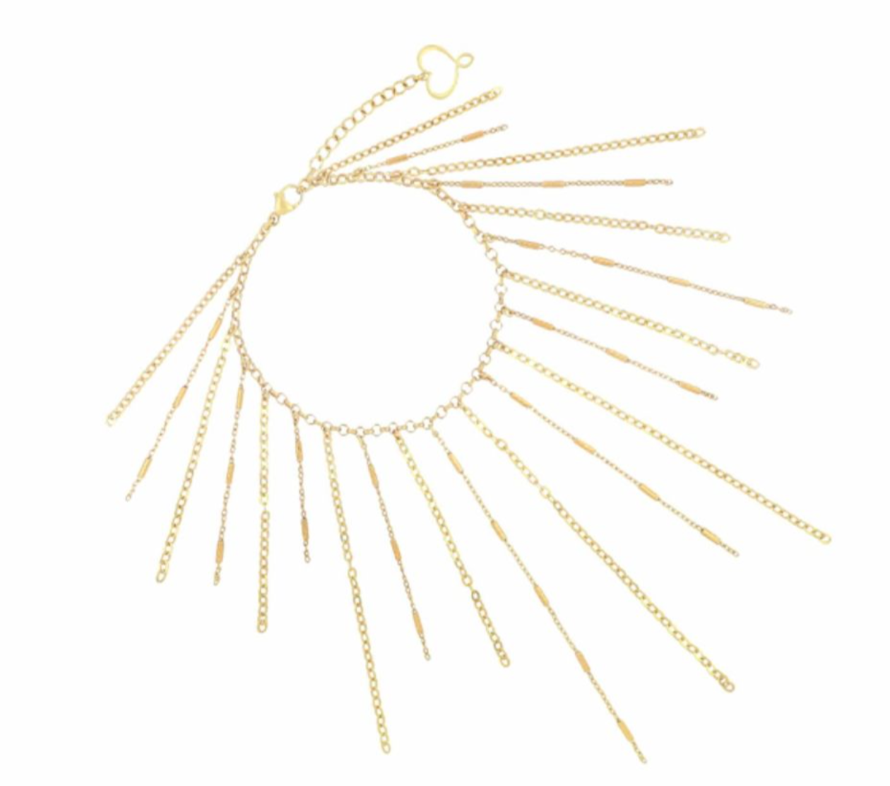 Bracciale realizzato in argento 925 con galvanica oro giallo ad alto spessore e resistenza con frange di catene pendenti.