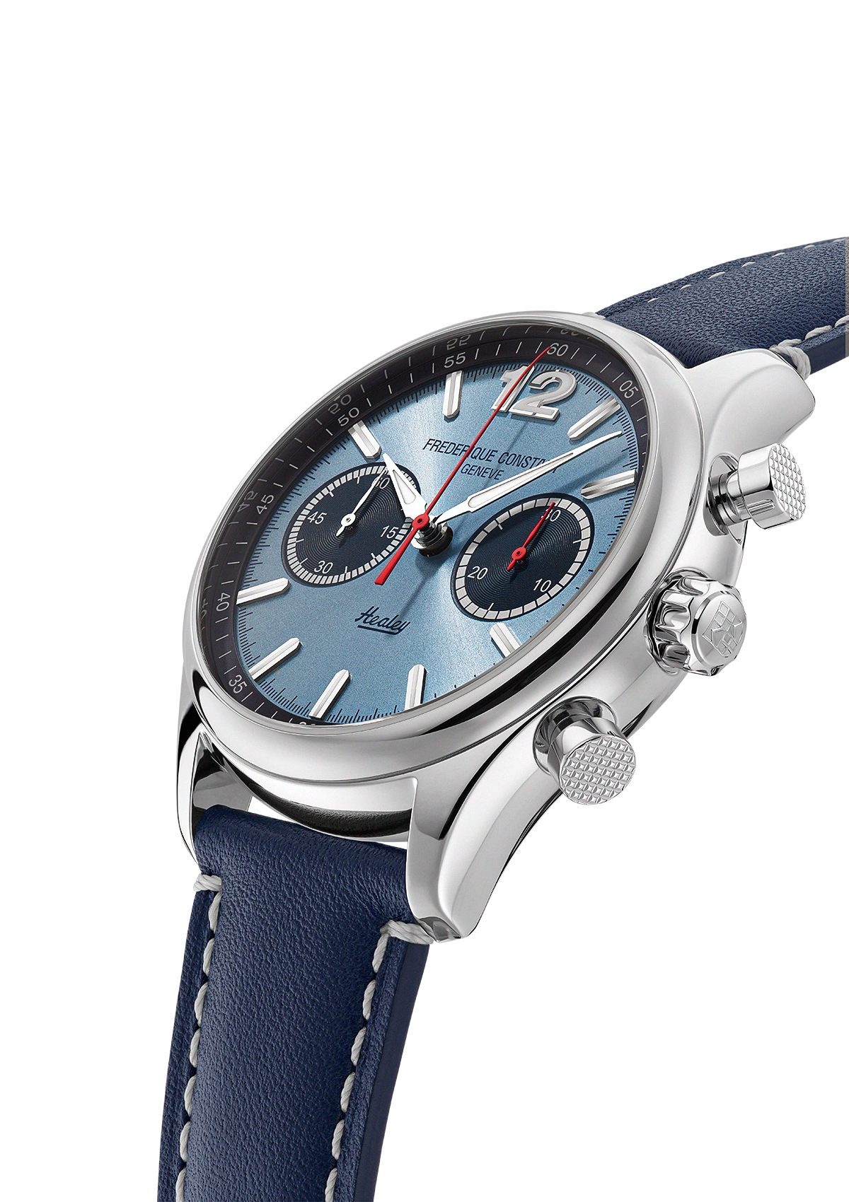 Limitato a 1.888 esemplari, questo cronografo sportivo si presenta con una cassa in acciaio da 42 mm e un fondello aperto. montato su un cinturino in pelle di vitello blu marine con impunture a contrasto, il modello si caratterizza per un design duale: due colori (blu sole sul quadrante e blu marine sul réhaut), due contatori (piccoli secondi a ore 9 e 30 minuti a ore 3) e due pulsanti, che ne sottolineano il carattere deciso.