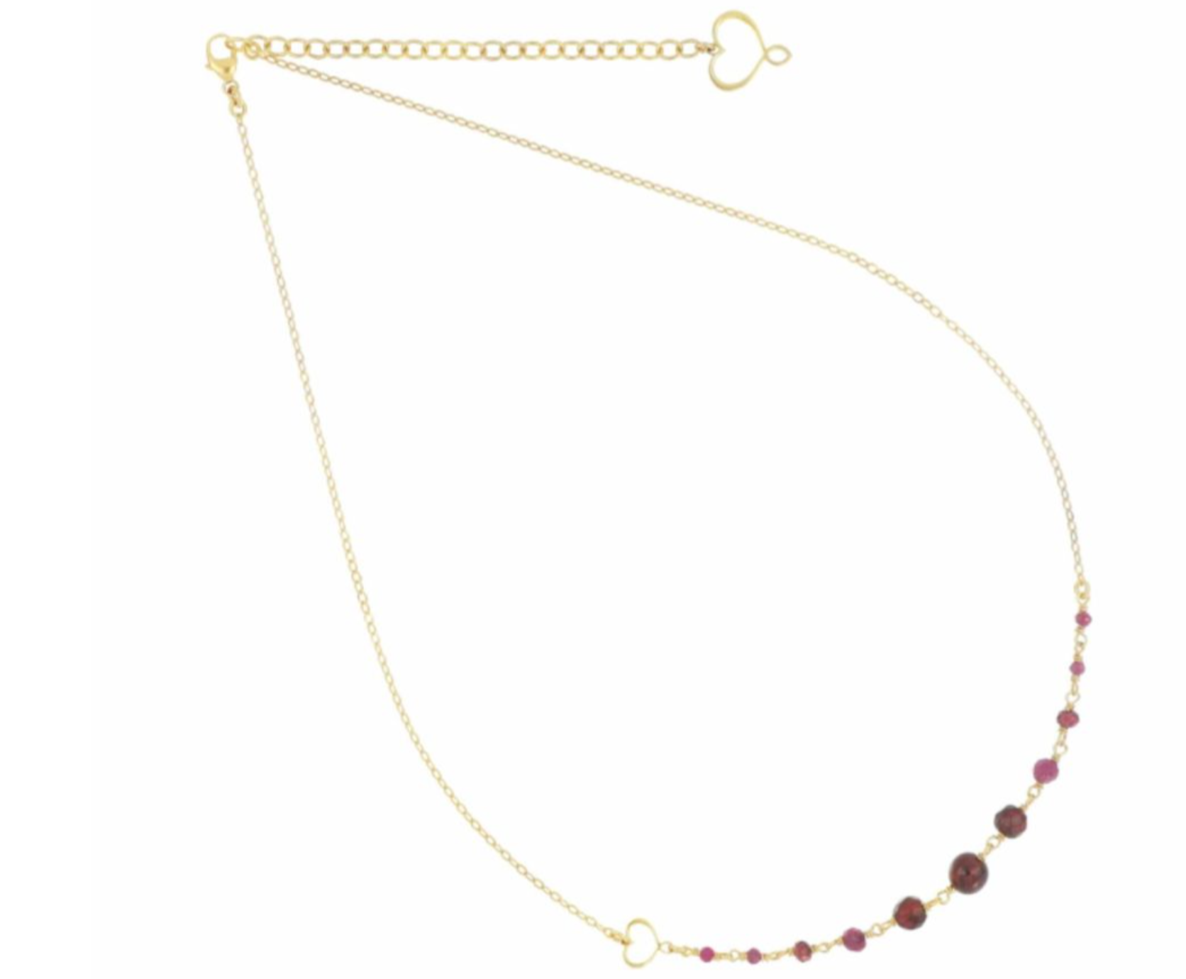 Girocollo in argento 925 con galvanica oro giallo ad alto spessore e ad alta resistenza. Il girocollo presenta una sezione centrale con pietre di rubini e granati in diverse dimensioni e logo maman. Può essere regolato da un minimo di 36 ad un massimo di 43 cm.Cuore Maman traforato all'estremità. Chiusura a moschettone.