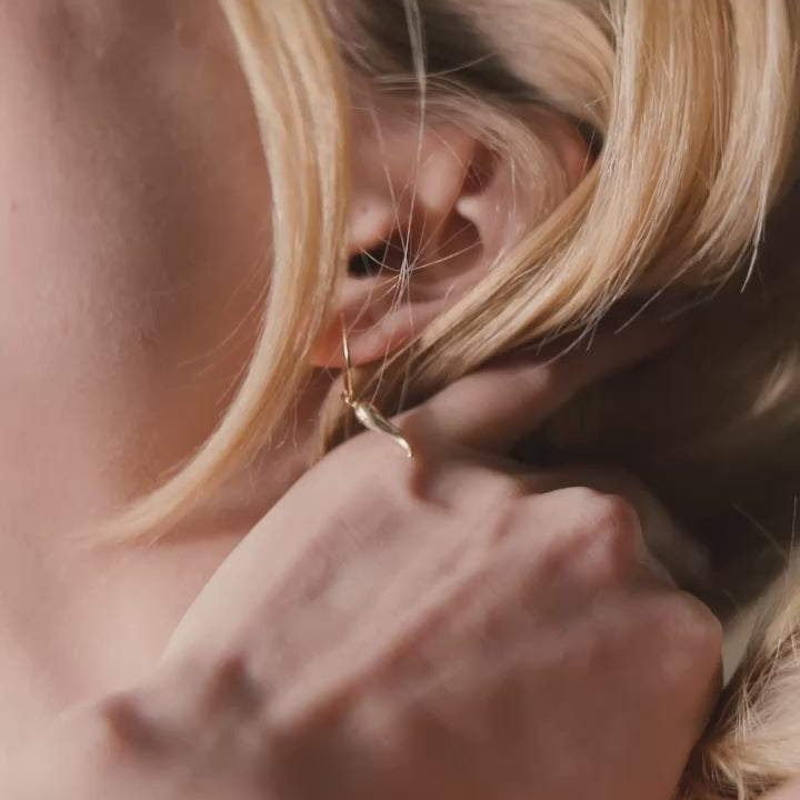 Orecchino a cerchio mini singolo in oro giallo 18 carati con cornetto pendente di lunghezza 1 cm.