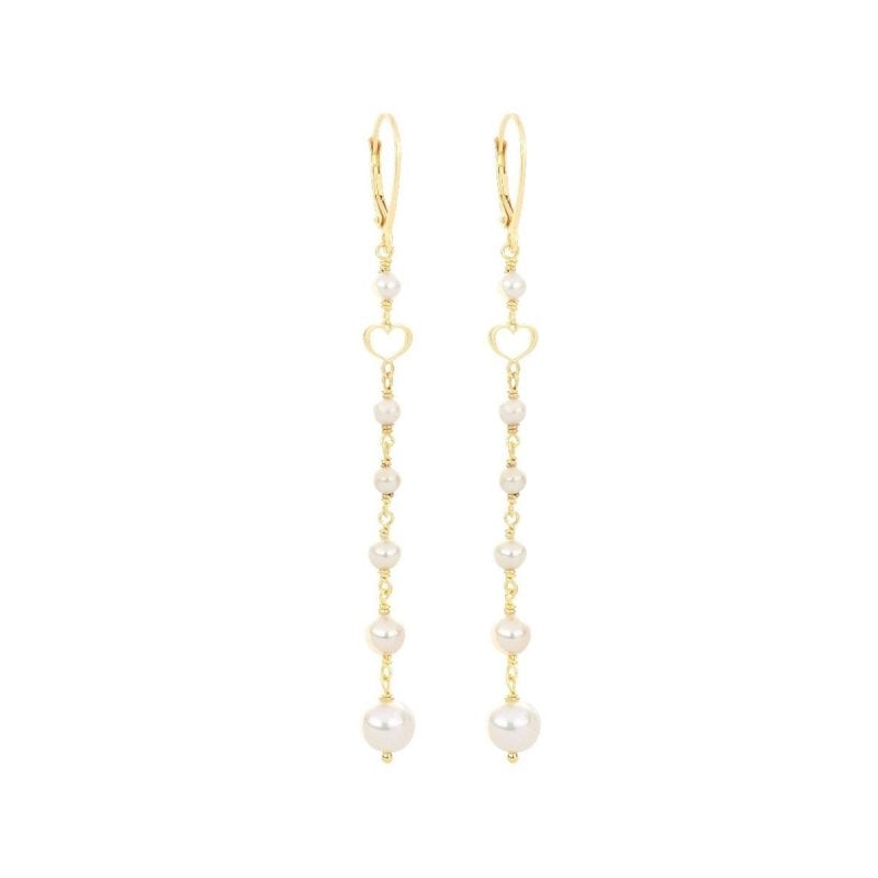Orecchini pendenti lunghi in argento 925 placcato oro con perle bianche.