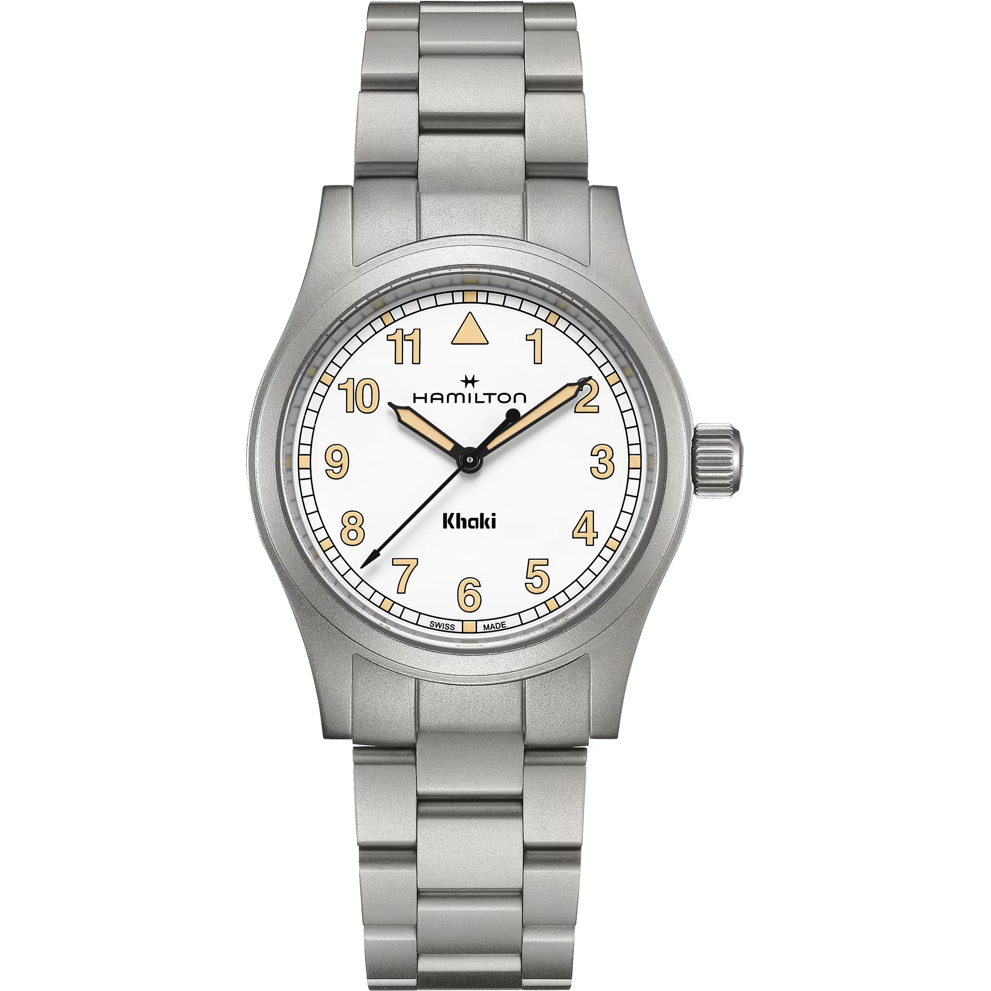 Perfetto per le tue avventure, il Khaki Field Quartz è un compagno affidabile e resistente, pronto per ogni esplorazione. Ispirato alla tradizione di precisione, innovazione e design funzionale di Hamilton, il Khaki Field Quartz combina un classico quadrante bianco da 38 mm con un moderno bracciale in metallo, offrendo uno stile intramontabile.