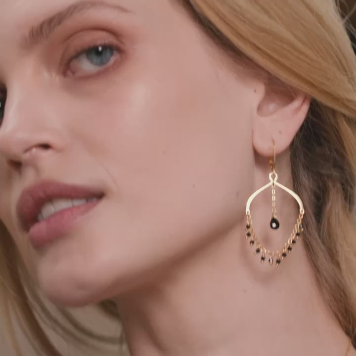 The earring features four black agate spheres measuring 3, 4, 6, 10 mm alternating with hematite disks.