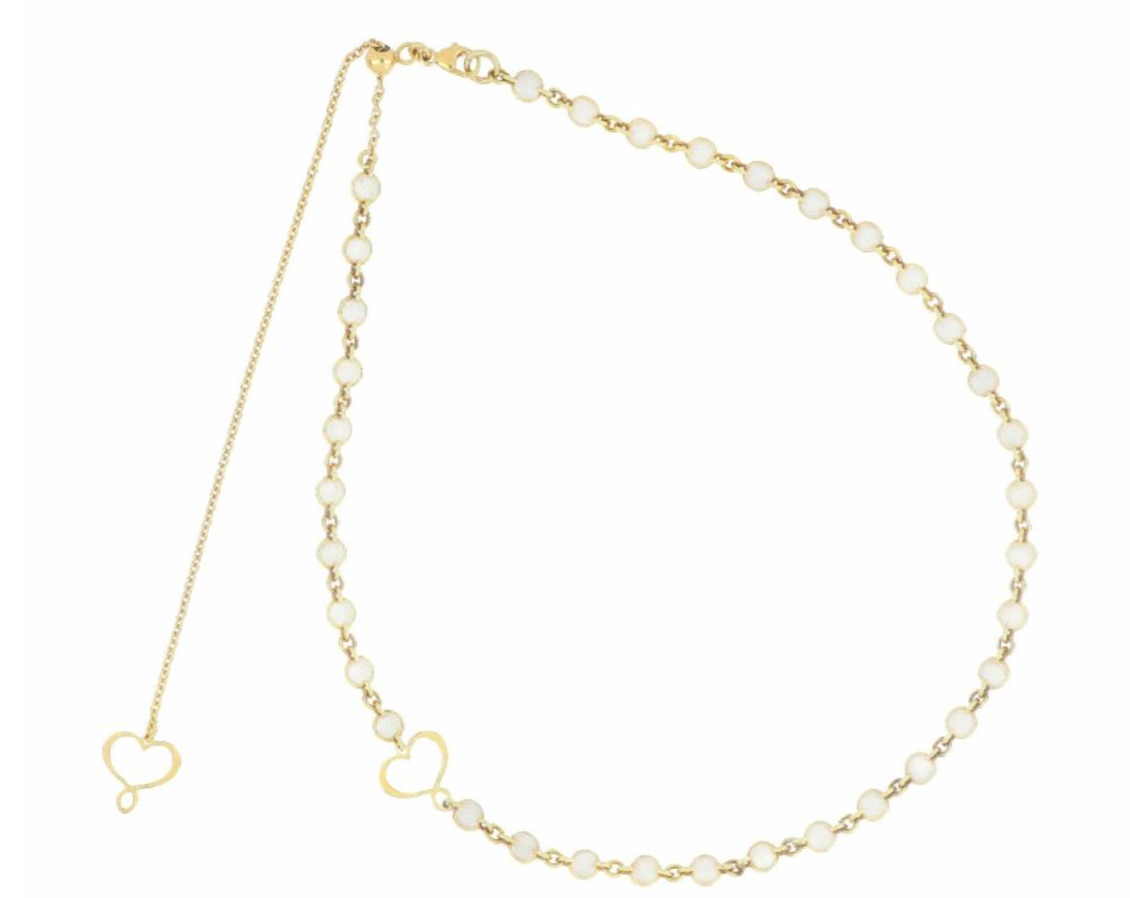 Double compo necklace-bracelet with scaramazze pearls made of 925 silver with rose gold plating of high thickness and resistance. Along the surface there are elements decorative such as spheres and portions of cylindrical Hematite. The peculiarity of this object is that it can be worn in three different ways. It can be worn as a 67 cm necklace or, by unhooking the two snap hooks, you obtain a choker and a bracelet. The length of the single choker is 43 cm, of the single bracelet 24 cm. There are two snap hooks and two white enamelled Maman hearts .This item is composed of GCPES and BRPES which can be purchased separately. Lobster clasp closure..
