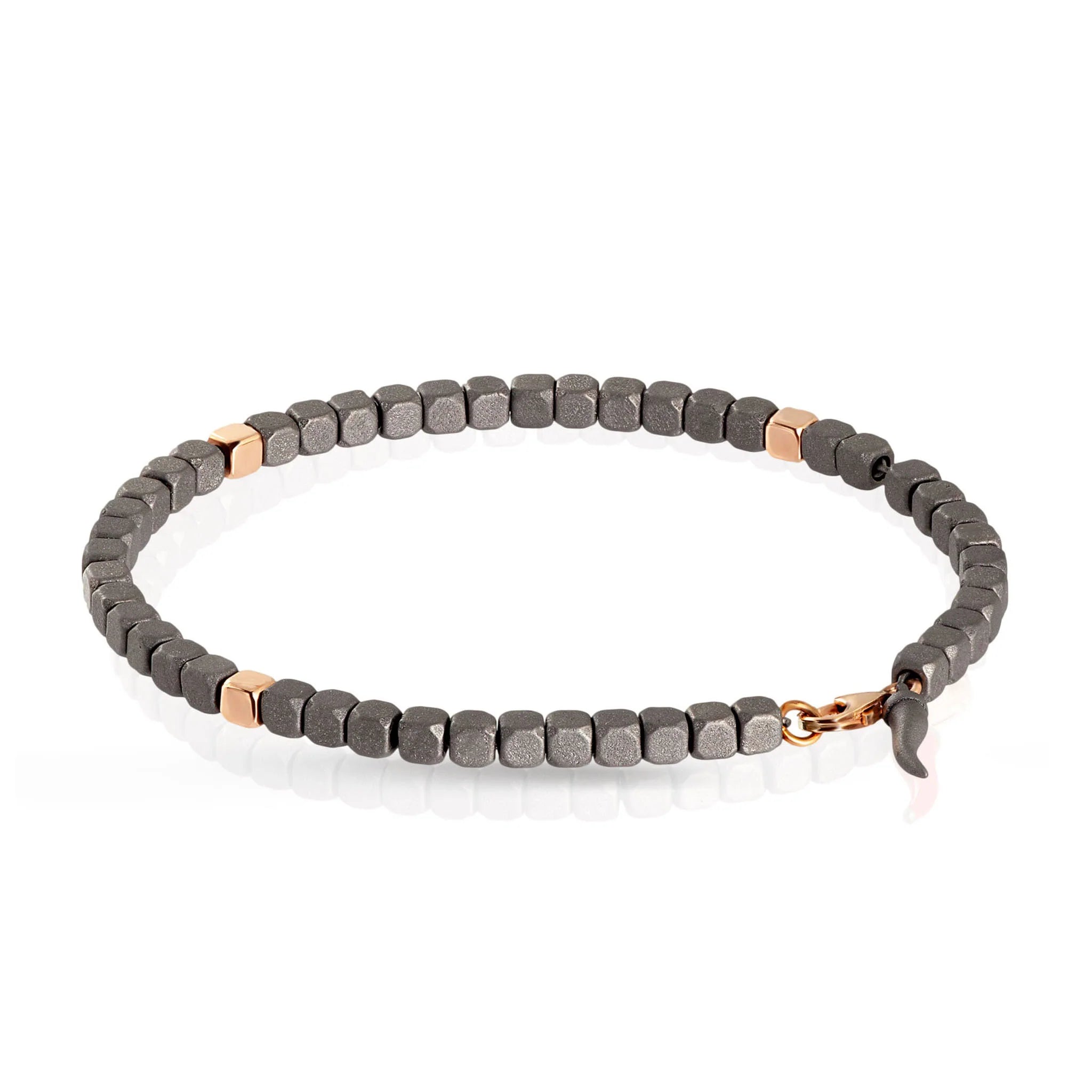 Men's bracelet with titanium cubes, 5 9kt red gold spheres and small titanium charms. A series of titanium cubes and 9 9KT red gold spheres make up the main structure of the bracelet. A chain runs through the entire section of cubes and spheres so the bracelet is resistant and mobile. The bracelet ends with a 9kt red gold hook clasp and titanium pendant charms, which give a touch of preciousness. The symbol of the MANO|J. brand, the 1-point black diamond, is found embedded in one of the last cubes. Easily wearable and adaptable to any wrist thanks to the titanium extension.